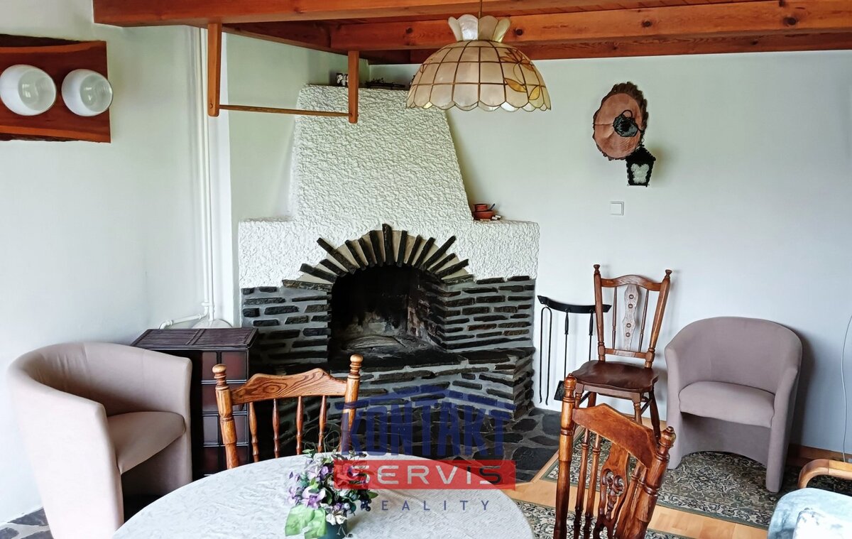 se nachází obývací prostor s krbem a kamny, kuchyň, koupelna s WC, pokoj,